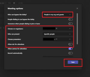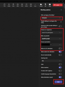 - Pada bagian Who can bypass the lobby? pastikan bahwa anda memilih Everyone agar tidak terjadi penumpukan partisipan di lobby room. Penumpukan partisipan dengan jumlah yang banyak di lobby room membuat partisipan lain tidak bisa join ke room meeting.